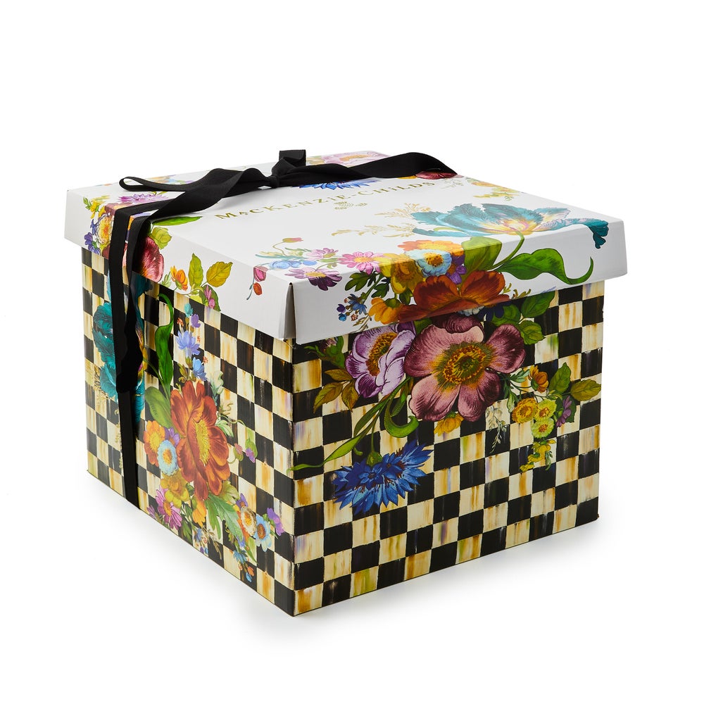 Our Gift Box Set is just as special as what’s inside of it and allows you to present a MacKenzie-Childs gift in our signature style. Kit includes one gift box (base & lid), white tissue paper, and ribbon, plus video instructions for box assembly via QR code.Here’s a handy guide to which types of products will fit inside this box:Three Tier Sweet StandLarge Pedestal PlatterLarge Mesh DomeTabletop Seasonal Items (pumpkins, bunnies, etc.)