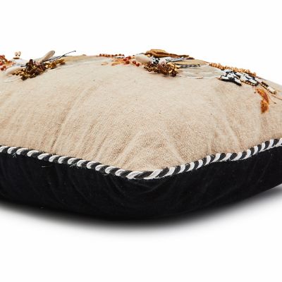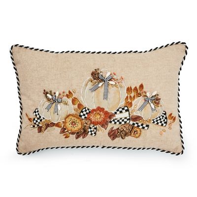 Accent your harvest home with this lumbar pillow, featuring a trio of pumpkins embellished with beads, sequins, and embroidery, along with three-dimensional gingham bows. It’s trimmed with black and white twisted cording.