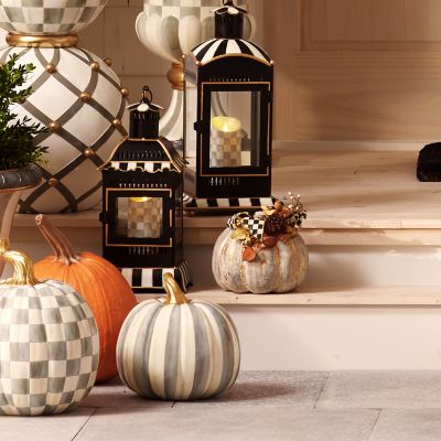 The Autumn Frost Pumpkin is the essence of frosty fall color. This sterling-colored pumpkin, accented with gold and copper leaf, sits on a nest of everlasting leaves, seedpods, pinecones, and paper anemones, finished with Courtly Check® ribbon.