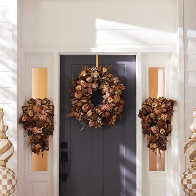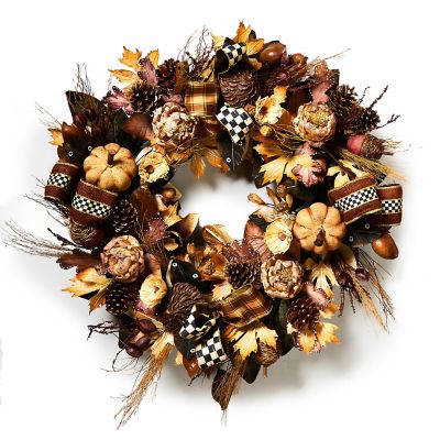 Make your home feel warm and welcoming with this autumn wreath, featuring an abundance of everlasting fall florals, plus paper mache pumpkins and gourds, and trimmed with Courtly Check® and burlap ribbon.
