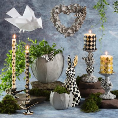 Light up a room with summery style any time of year. Black Bee Dinner Candles feature stripe and harlequin patterns with whimsical metallic gold bees. Set of two hand decorated candles; paraffin palm wax blend.