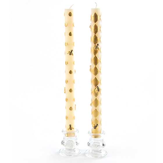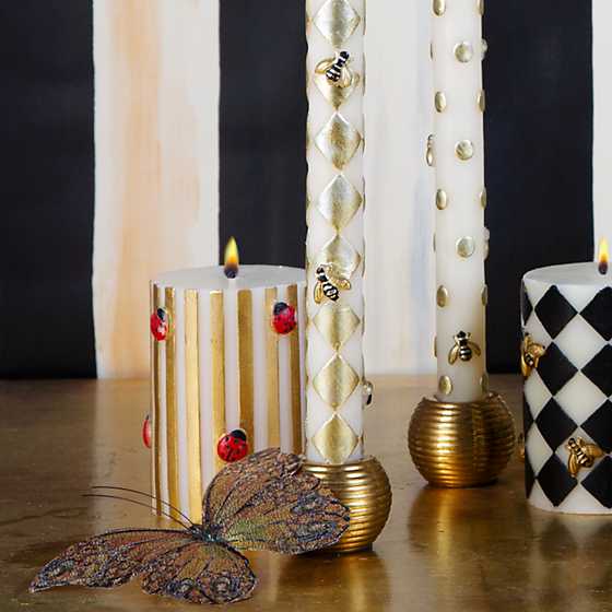 Light up a room with summery style any time of year. Gold Bee Dinner Candles feature stripe and harlequin patterns with whimsical metallic gold bees. Set of two hand decorated candles; parrafin palm wax blend.