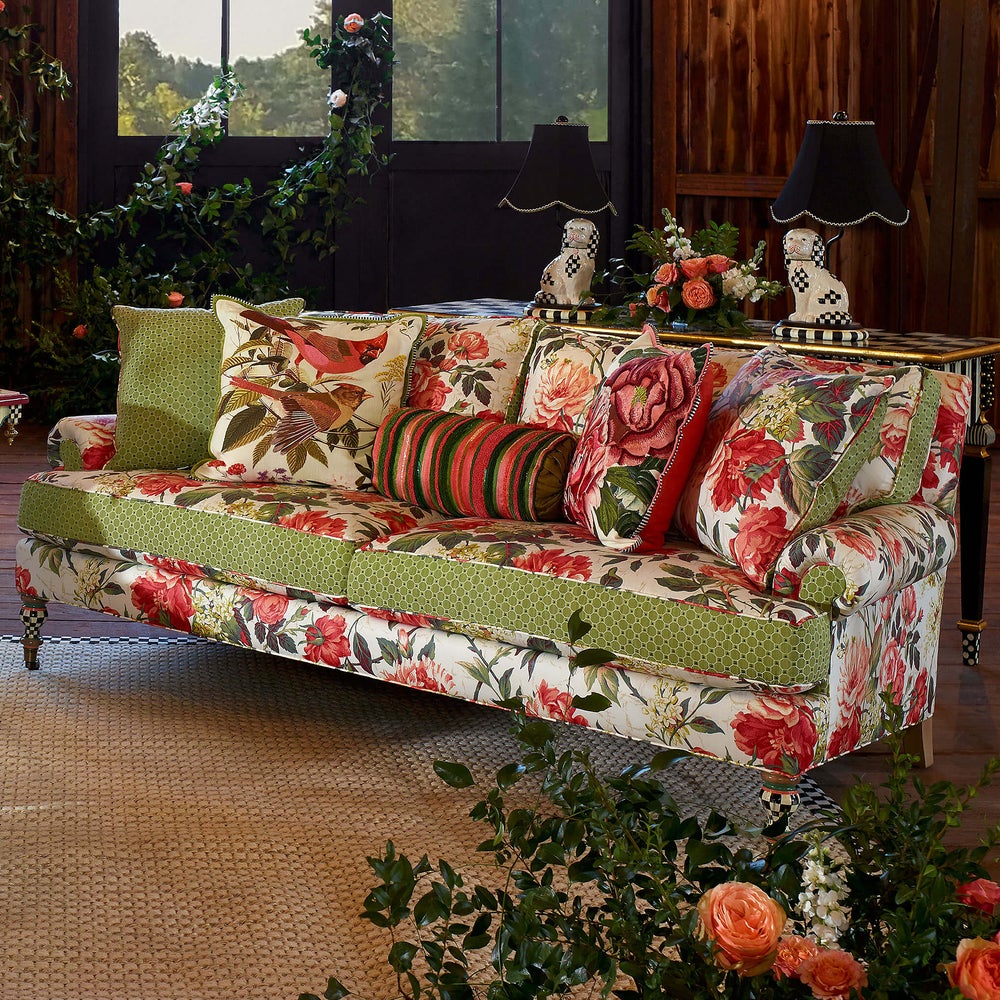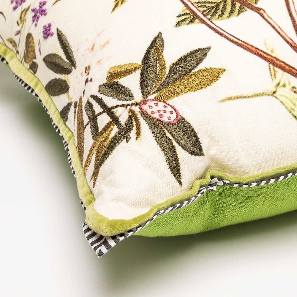 Our Bird Watchers Pillow is perfect for your home tweet home. Lavish embroidery details birds on a printed cotton surface with French knots. A striped flange and velvet piping trim the edges, with cotton fabric on the back.