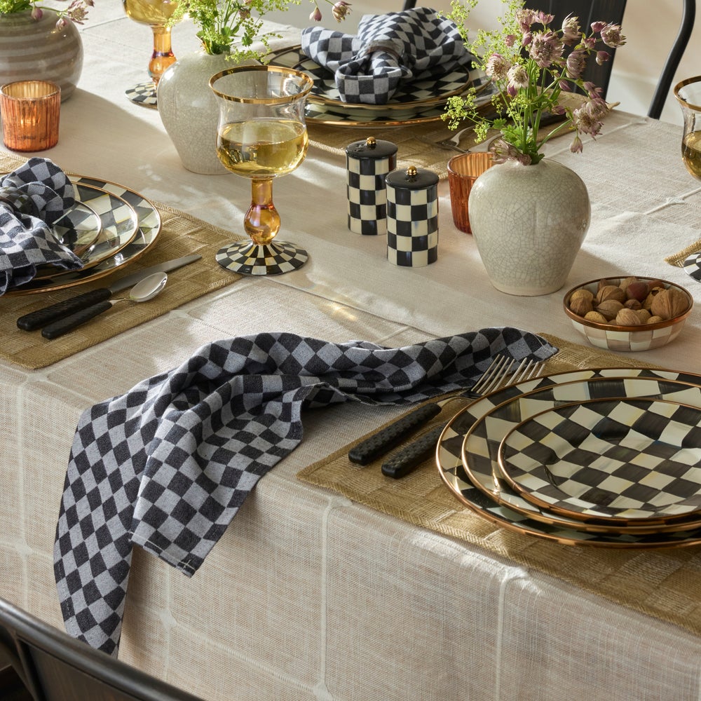 Decorate your tabletop with this set of four black check napkin rings, crafted from etched glass. Pair with our Courtly Check plating or other iconic dinnerware and Everyday place settings for the perfect tabletop collection.