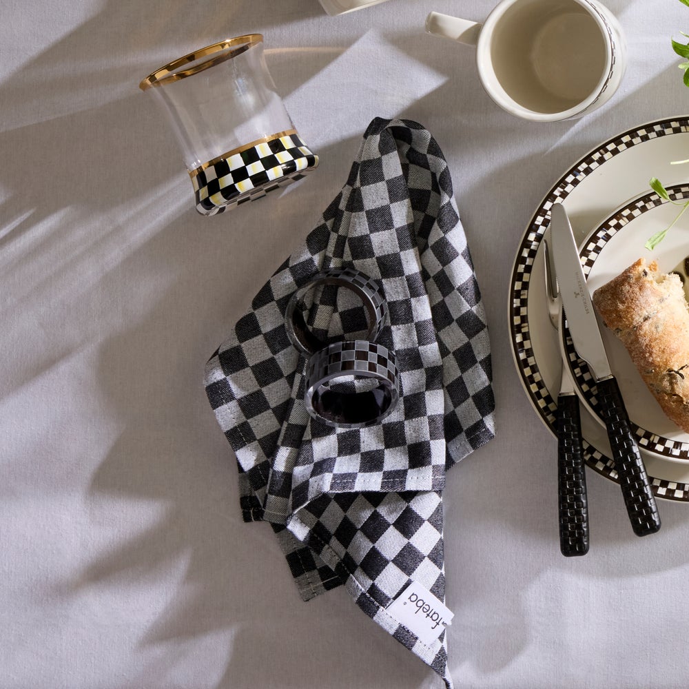 Decorate your tabletop with this set of four black check napkin rings, crafted from etched glass. Pair with our Courtly Check plating or other iconic dinnerware and Everyday place settings for the perfect tabletop collection.