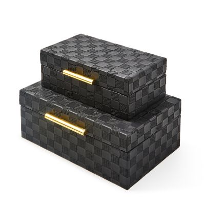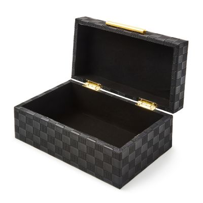 Make storage stylish with this small box featuring an embossed faux leather check surface and shiny gold hardware. It’s perfect for important papers, jewelry, or other trinkets.