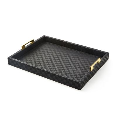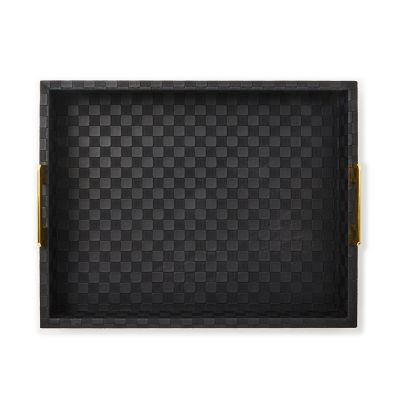 Make serving stylish with this large tray featuring an embossed faux leather check surface. Shiny gold handles add to the ease of carrying it wherever it’s needed—indoors or out.