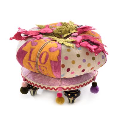 Pop goes the pink on our Bleeding Hearts Footstool. Bursting with patterns, this playful piece mixes alternating appliqued velvet panels featuring the word LOVE with dots embroidered on raw silk. Topping it all off is an explosion of wired fabric hearts and leaves that can be molded into various arrangements, allowing you to customize its look again and again. Oversized rickrack trim and swinging pom-pom tassels add even more to a conversation piece that’s sure to have everyone talking.