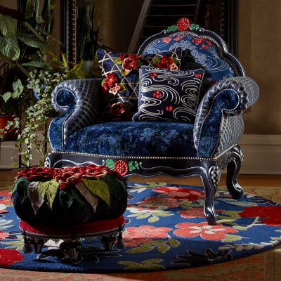 Made of masterfully carved European beechwood and hand-painted in Aurora, New York, our Bluetopia Chair bathes you in blue bliss. Enhancing the frame’s elegance is a mix of blue fabrics, crowned with a floral print featuring plum blossoms that was inspired by a Japanese kimono. The finishing touches include blue harlequin stitched cording around the arms and pewter nailhead trim along the top and bottom. All in all, it’s a rhapsody in blue.