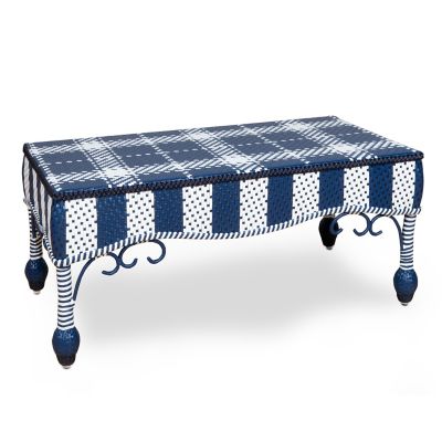 Take wicker up a notch with our Boathouse Outdoor Coffee Table, a versatile piece that’s perfect for parking a summer drink. It’s fashioned in a brightly bold geometric plaid and stripe pattern done in royal blue, navy blue, and white that’s wrapped on a PVC frame.
