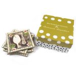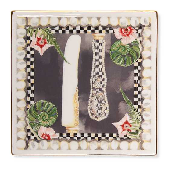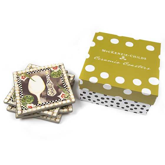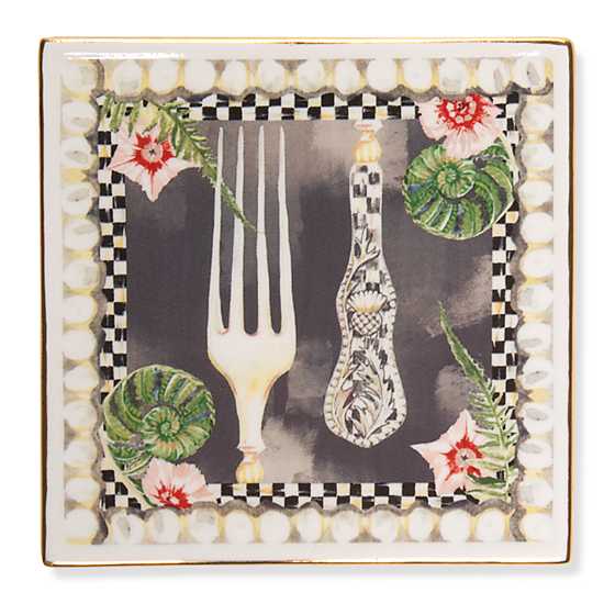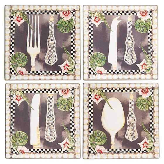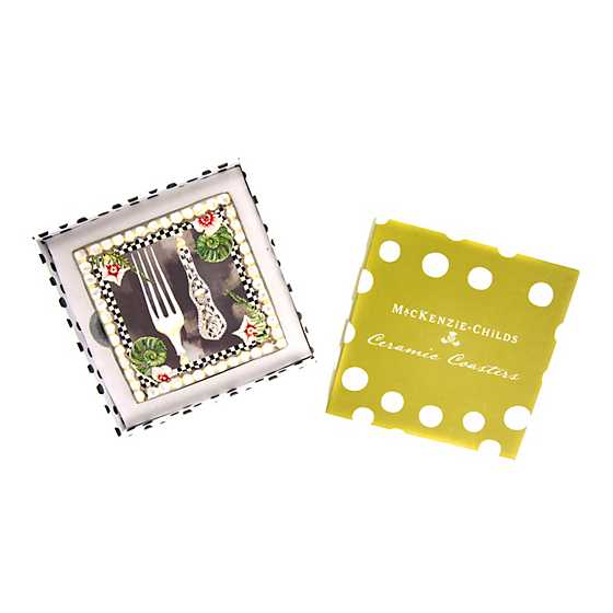 Keep surfaces clean and protected with our fun set of four Bon Appetit Coasters, featuring motifs of knives, forks, and spoons hand-applied to a ceramic surface that is backed with natural cork. Beautifully boxed, they make a charming gift.