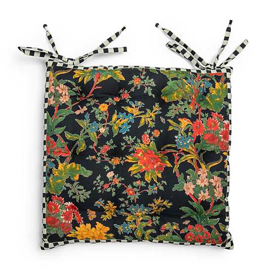 Turn every dining chair into the best seat in the house with our Botaniste Chair Cushion. Featuring a perfectly balanced combination of comfort and style, this posh pad has colorful flora and fauna against a black backdrop, fitted with striped piping and ties.