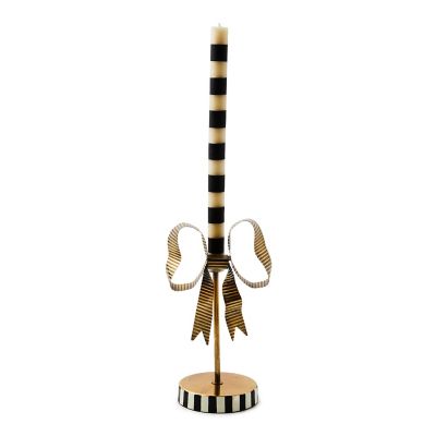 This short iron candle holder is crowned with a stainless-steel crimped bow atop a base that’s hand-painted with black and ivory stripes. It holds one of our dinner candles.
