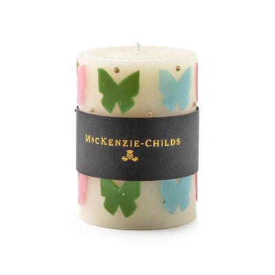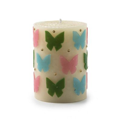 This hand-rolled, 4″ pillar candle beeswax-blend candle features hand-cut and hand-applied wax butterflies in pastel colors along with rhinestone studs. It stands elegantly on its own or creates a dramatic centerpiece when grouped with pillars and tapers of varying heights.
