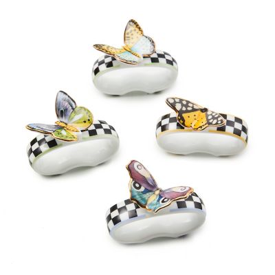 We’re aflutter for this set of four porcelain napkin rings, decorated with hand-painted checks and topped with a dimensional butterfly, trimmed with gold lustre.