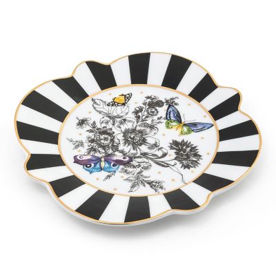 Set a table that’s always as fresh as spring with this porcelain salad plate that features a pattern of butterfly toile, trimmed with black and white stripes and gold lustre.