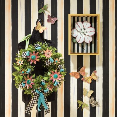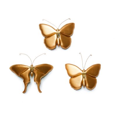 Take a flight of fancy with the Meadow Butterfly Trio. Featuring transfer decorations of our signature patterns on the gold-edged wings of three butterflies and more floral transfers on their bodies, they’re topped with wire antennae. An adjustable metal hanger on the back lets you hang them on the wall at different angles. Set of three.