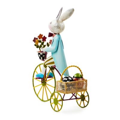 Stroll into spring with this hand-painted bunny riding a metal bicycle that’s adorned with a basket of florals in front and a cart full of decorated eggs in back.