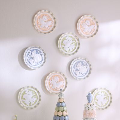 This trio of resin trinket trays display Wedgwood-inspired designs in pale shades of green, blue, and peach, trimmed with Sterling Stripe. Store small treasures on them or hang them on the wall for a pretty display.
