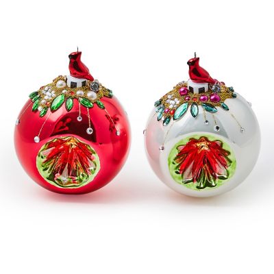 Make the tree merry with this set of two glass reflector ornaments, trimmed with beads, rhinestones, and faux pearls and topped with cardinal finials.