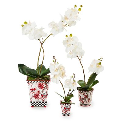 Anyone can “grow” this large everlasting orchid that’s potted in a ceramic pot, decorated with a red and pink cardinal and floral toile pattern that’s trimmed with black and white roping and Courtly Check®.