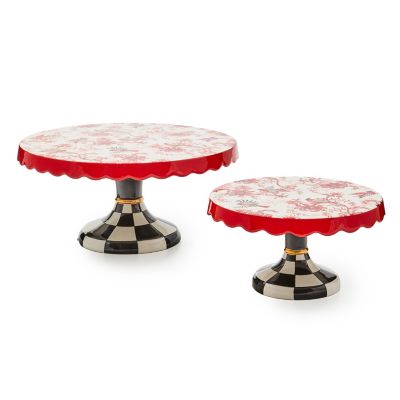 Serve holiday treats the merry and bright way on this small ceramic pedestal platter that’s decorated on top with a red cardinal and floral toile pattern and set on a base of black and white checks.