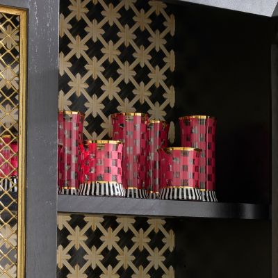 Make any occasion more special by setting the table with this set of two hand-painted, mouth-blown highball glasses. Featuring fuchsia checks on a striped base, they’re trimmed with gold lustre.