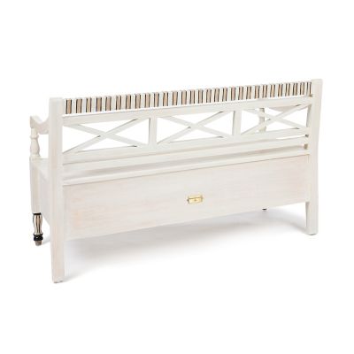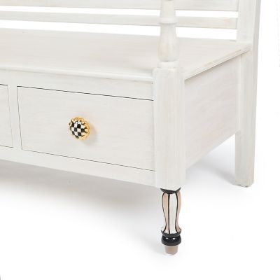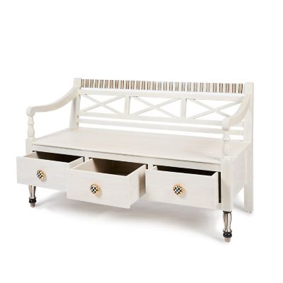 Looking for an entry bench? Look no further than the Carriage House Bench, which offers both style and storage. Made of hardwoods in India, it has a sandstone finish with accents hand-painted by our artisans in Aurora, New York. Delightful details include three generous drawers with ceramic Aurora Artisanal knobs finished with gold lustre.