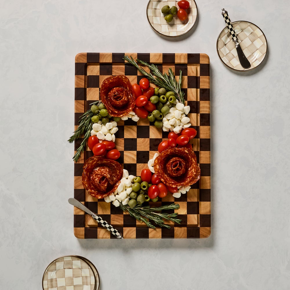 Keep a smart, sophisticated Check Carving Board out for countertop beautification or to carve meats in style at a moment’s notice. The check pattern comes from a mix of acacia and rubberwood, and there’s a well outlining the surface to catch the juices.