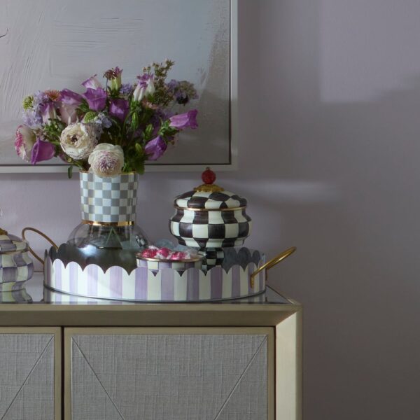 For housing treasured trinkets, there’s no container more charming than our Courtly Check® Curiosity Pot. The handsome curved pot with a perfectly matched pedestal is dressed in our signature checks and topped off with a lid featuring a brass bobeche and carved crimson bead finial.