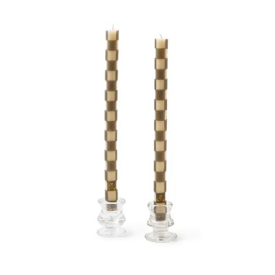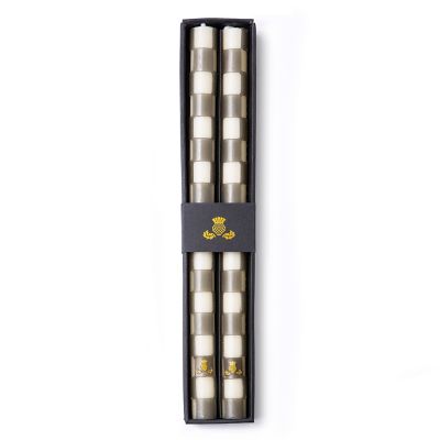 Turn your everyday meals into something more memorable with our Grey Check Dinner Candles. This set of two beeswax-blend candles, featuring hand-cut and hand-applied wax checks, adds the glowing touch of MacKenzie-Childs to your dining table. The finishing touch is a golden thistle on each candle.