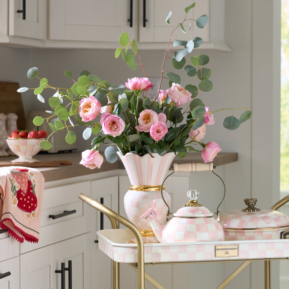 Our handcrafted Rosy Check Ceramic Great Vase—mixing color-dragged Rosy Check, vibrant stripes, and gold lustre accents—is hand-painted by our artisans here in Aurora. Turn it over and you’ll see the stamps of each of the artisans who had a hand in its creation. Generously sized for an impressive presentation.