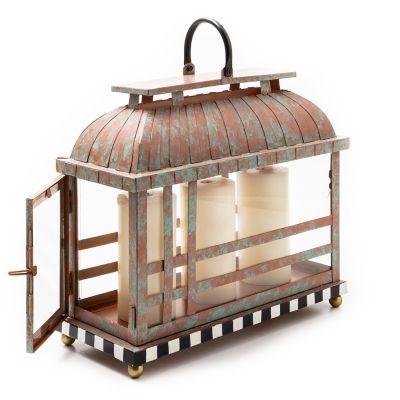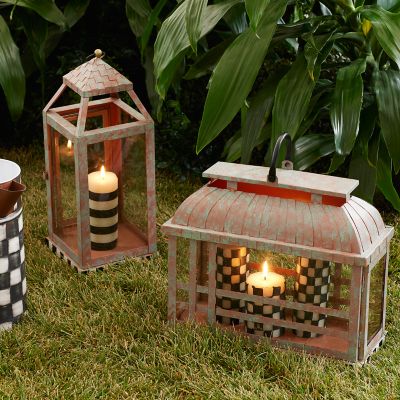 Keep the party going after dark with our Large Check It Out Lantern. Made of iron with a verdigris copper finish, it holds pillar candles behind glass panels. Pair it with the Small Check It Out Lantern for extra illumination.