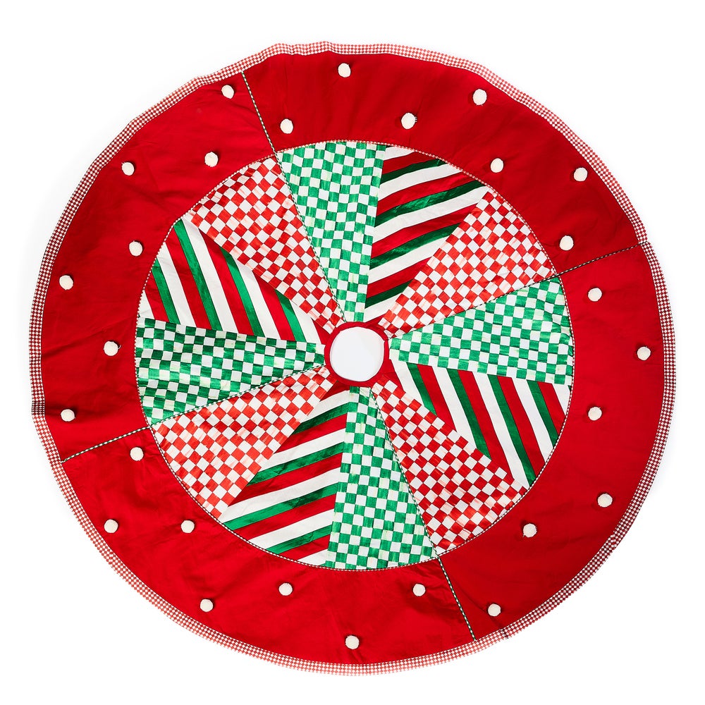 Add MacKenzie-Childs signature charm to your Christmas season with the Check It Out Patchwork Tree Skirt. In a bold display of pattern-on-pattern style, this tree skirt alternates between sections of red and green checks, stripes, and dots. A wonderful gift for Christmas lovers or the perfect statement-making piece for your own tree.