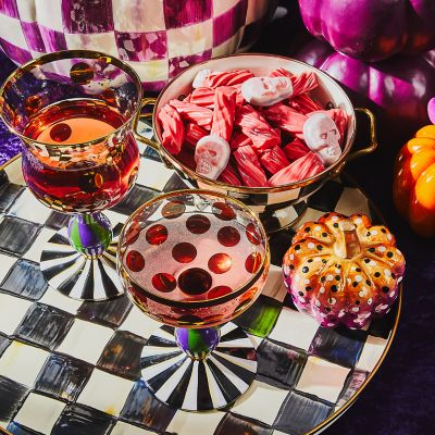 Make any occasion more special by setting the table with this mouth-blown coupe glass. Featuring hand-applied gold dot decals atop a purple and green stem set on a hand-painted Courtly Stripe base, it’s trimmed with a gold lustre.