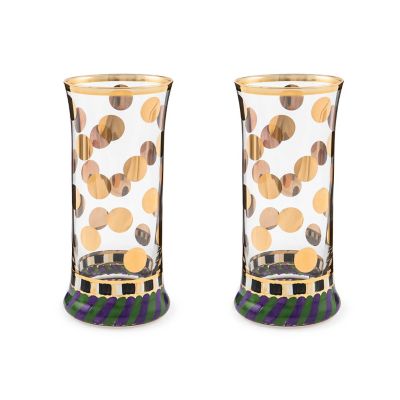 Make any occasion more special by setting the table with this mouth-blown highball glass. Featuring hand-applied gold dot decals on a base of hand-painted purple and green stripes, it’s trimmed with gold lustre.