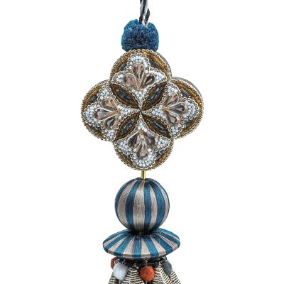 Use this tassel to accent a curtain tieback, chandelier arm, or doorknob. Topped with a beaded medallion, it has a skirt of grey threads, accented with strands of small pom-poms.