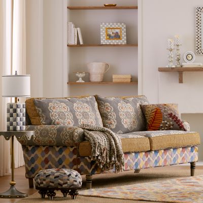 Hardwood frame and hand-painted feet. Attached pillow top comprised of 100% polyester embroidered cover with glass beads and faux leather accents. Pieces may vary due to the handmade nature of each product. Imported.