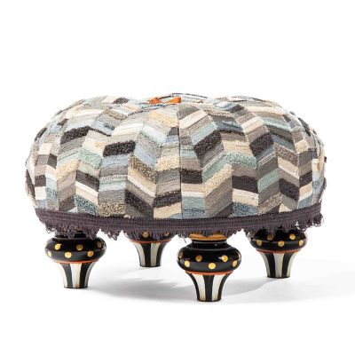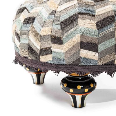 Stylishly accompany any armchair with this footstool, upholstered in machine-embroidered and beaded fabric and topped with a leather button. It sits on hand-painted wood feet and is finished with scalloped fringe.