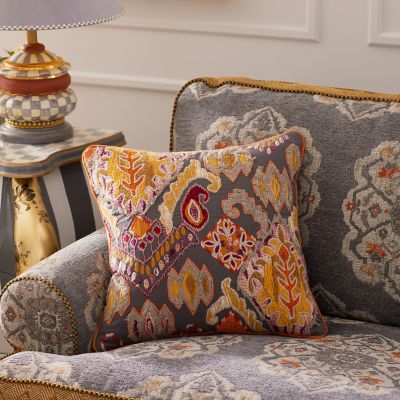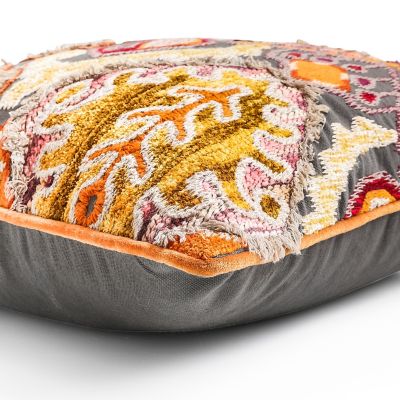 You can’t help but touch this textured pillow, detailed with a machine-embroidered mosaic pattern, accented with fringe and chenille, and finished with persimmon velvet piping.