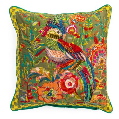 It’s easy to see why you’ll flock to this cockatiel pillow. A printed cockatiel on cotton linen is lavishly embellished with beads, embroidery, and textural stitching, finished with a border of chartreuse checks, and trimmed with cotton-velvet cording.