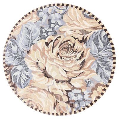 This wool-blend 6′ round rug is mostly sheared, featuring a single rose in muted hues of grey, ivory, and brown and trimmed with a border of brown and tan checks.