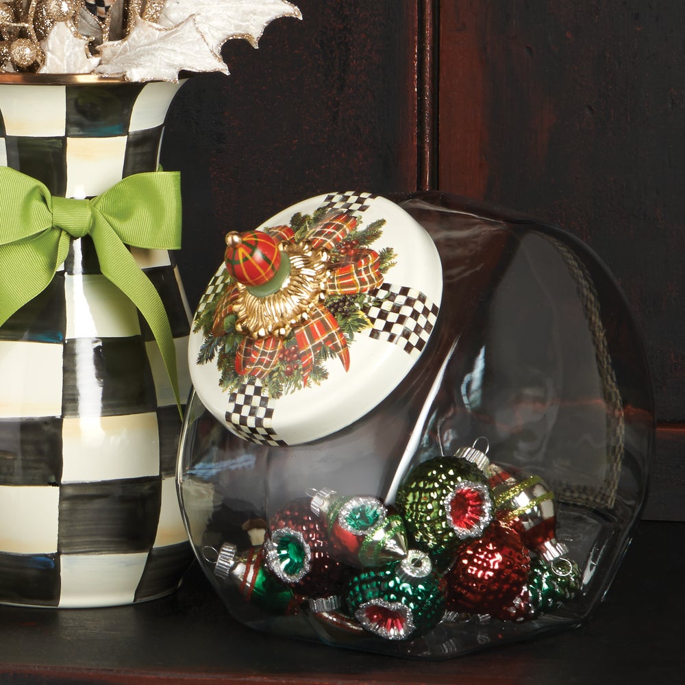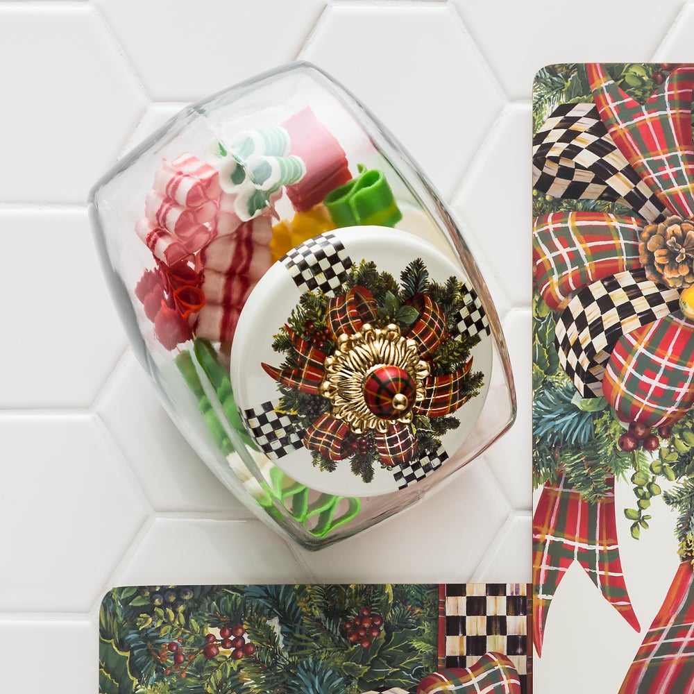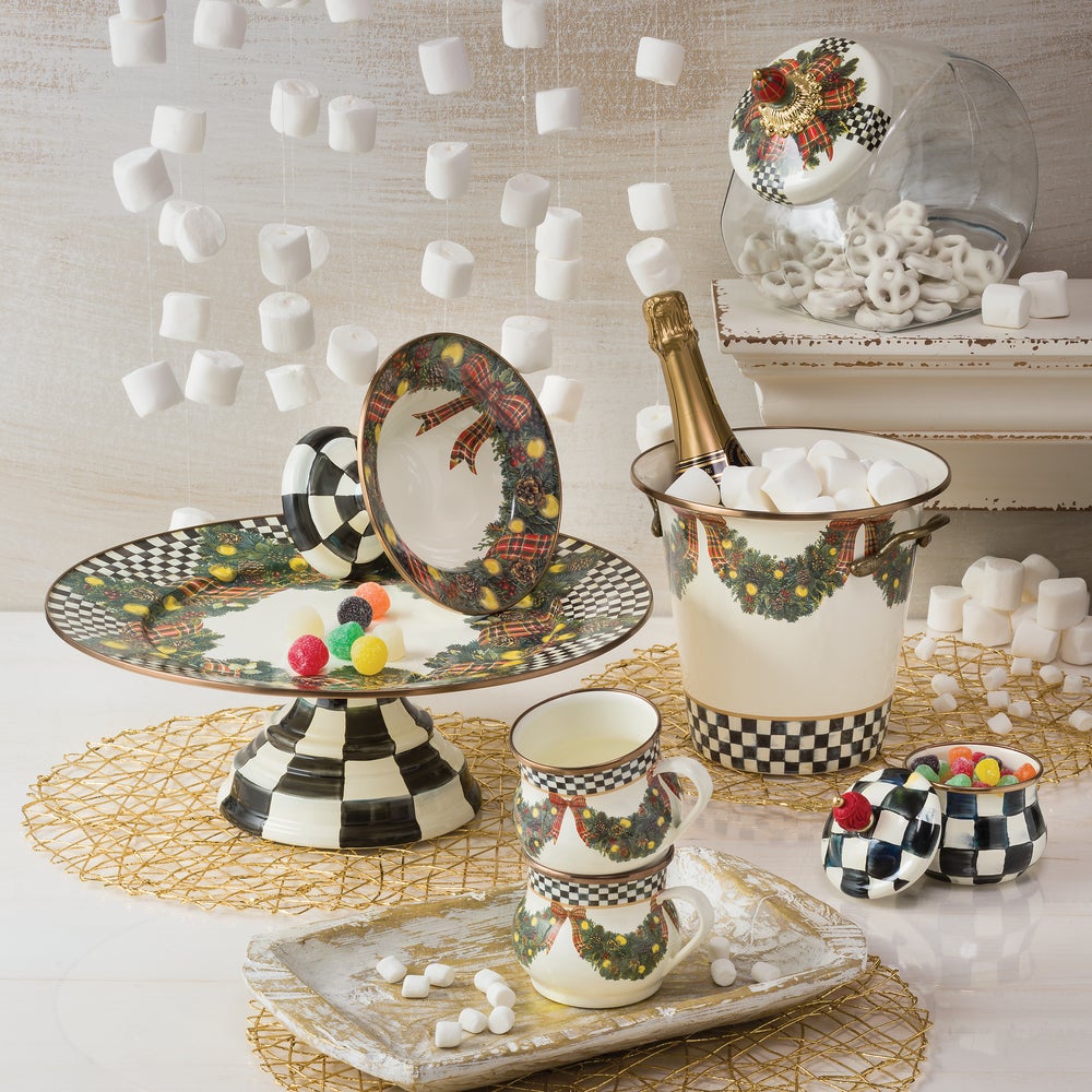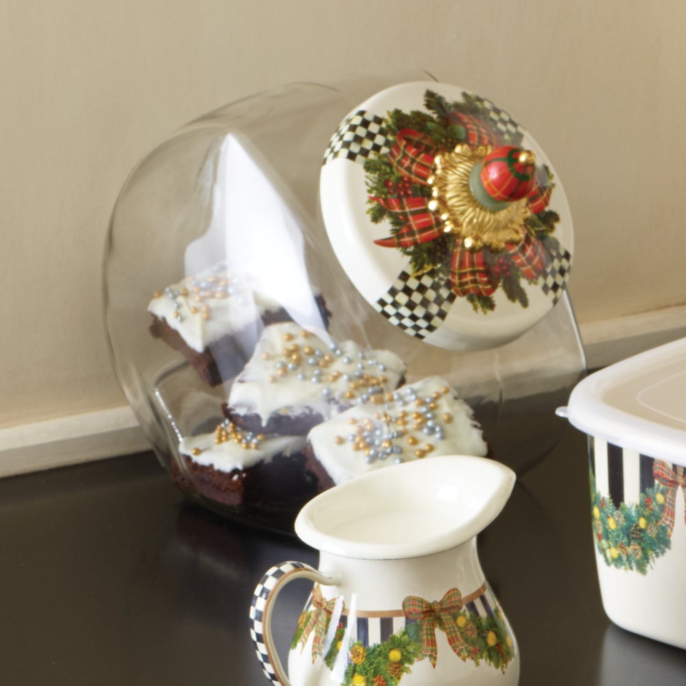 Stunning collectible enamelware that will become a perennial favorite during the season of nostalgia. Each Cookie Jar with Evergreen Enamel Lid is decaled with tartan plaid ribbons and golden apples, with greenery of blue spruce, red cedar, Scots pine, live oak, and holly.
