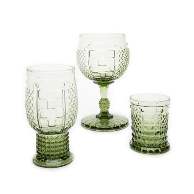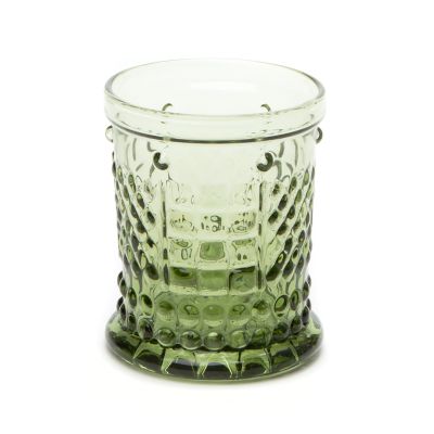 Everyday dining is extraordinary with the Coquette collection of glassware. The Green Coquette Juice Glass is mouth-blown and molded with a pattern of diamonds, checks, and dots, with our thistle logo etched on the bottom. Mix and match the juice glass with the other colors in the Coquette collection and pair it with our colorful dinnerware.