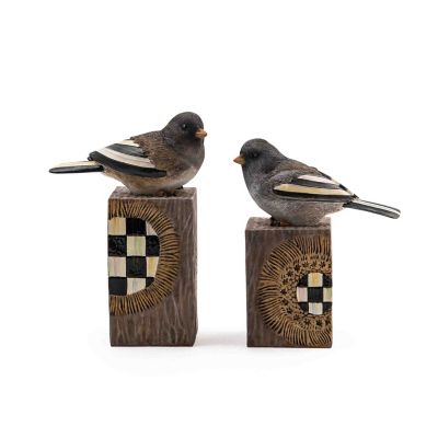 Welcome fall with this set of two faux carved birds, accented with wings of Courtly Stripe, atop pedestals, accented with Courtly Check® sunflowers.