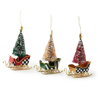 Make the tree merry with this set of three tin sleigh ornaments, hand-painted with checks and stripes, that hold bottle brush trees. They can be used as tabletop decor, too.