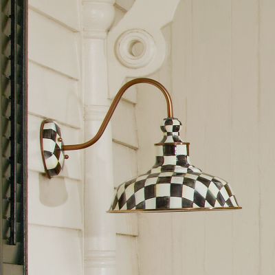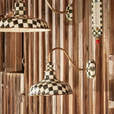 Walking the grounds one evening, we stopped to notice something we had passed countless times before—the classic lights of our barn—and, pardon the pun, a light went on. In our 12″ Courtly Check® Barn Sconce, we’ve dressed a simple silhouette in signature MacKenzie-Childs patterns, inside and out, to elevate a humble workhorse around the barn into an agrarian-chic accent for even the most urban abodes. Hand decorated enamel over sturdy steel. Maximum 100-watt, 120-volt type A lamp bulb; ETL approved for dry or damp (not wet) locations.