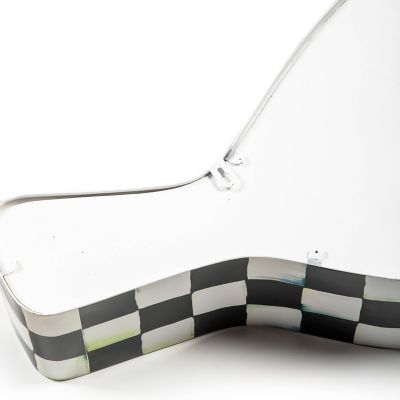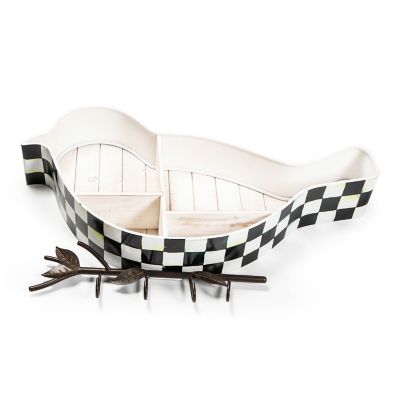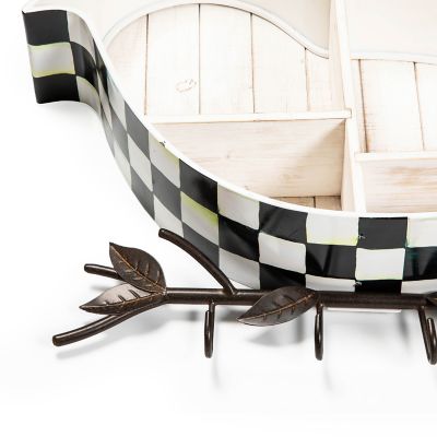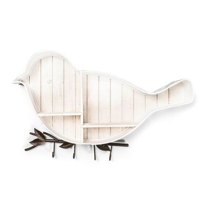 Pretty and practical, this bird-shaped metal and wood wall shelf is perfect for displaying small mementoes, as well as holding your keys. Accented with our signature pattern, it’s set on a metal branch with four hooks and has two shelves.