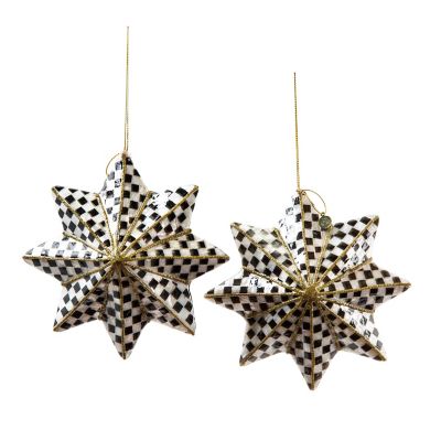 Trim the tree with a set of two dimensional Capiz star ornaments done in hand-painted black and white checks, trimmed with gold glitter.
