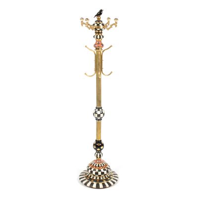 The Courtly Check® Coat Perch is one of our signature pieces and will make a statement in your entry or mudroom, offering storage that is both stylish and special. It’s completely handmade by our artisans in Aurora, featuring three levels of hooks, hand-painted Courtly Check® details, 22K-gold lustre accents, and is crowned with a ceramic bird on top.